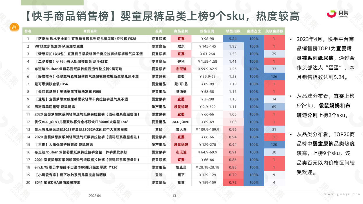 为了解4月母婴赛道各品类基本情况,果集发布了《2023年4月母婴赛道社媒电商报告》,该报告指出母婴品类在品牌数、店铺数和商品数上相较于3月有所增长。其中,抖快平台的母婴品类在社媒电商上持续发力,推动了销售表现增长。