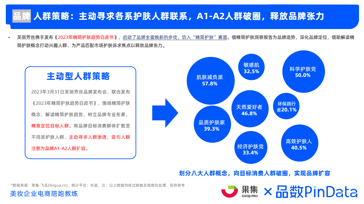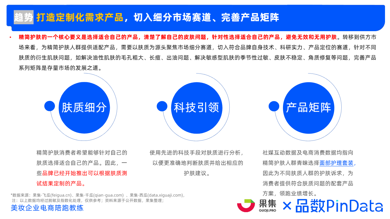 精简护肤的一个核心要义是选择适合自己的产品,清楚了解自己的皮肤问题,针对性选择适合自己的产品,避免无效和无用护肤。转移到供方市 场来看,为精简护肤人群提供适配产品,需要以肤质为源头聚焦市场细分赛道,切入符合品牌自身技术、科研实力、产品定位的赛道,针对不同 肤质的衍生肌肤问题,如解决油性肌肤的毛孔粗大、长痘、出油问题、解决敏感型肌肤的季节性过敏、皮肤不稳定、角质修复等问题,完善产品 系列矩阵是存量市场的发展之道。