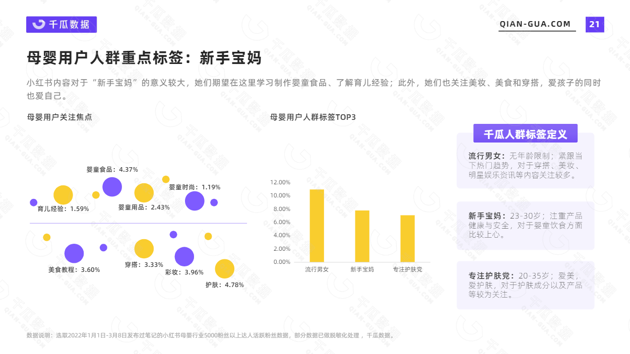 千瓜数据独家推出《2022年千瓜活跃用户画像趋势报告(小红书平台)》,对2022年小红书全行业活跃用户进行洞察,并针对美妆、美食、母婴、家居、服饰穿搭、宠物、减肥健身7大行业核心人群进行解析,为品牌洞察小红书不同群体画像和消费趋势提供数据支持和营销方向。