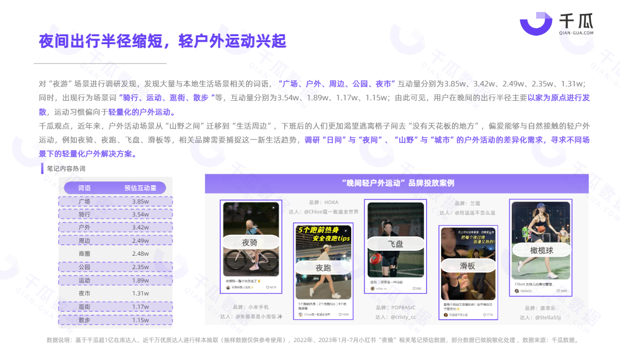本期千瓜推出《千瓜2023夜间营销数据洞察报告(小红书平台)》,围绕七大行业(美食|家电数码|美妆|个护|家居|保健品|旅游),从夜食、夜游、夜护三方面,进一步探索消费与内容趋势,更好地帮助品牌挖掘夜间营销价值,拓展消费新场景。