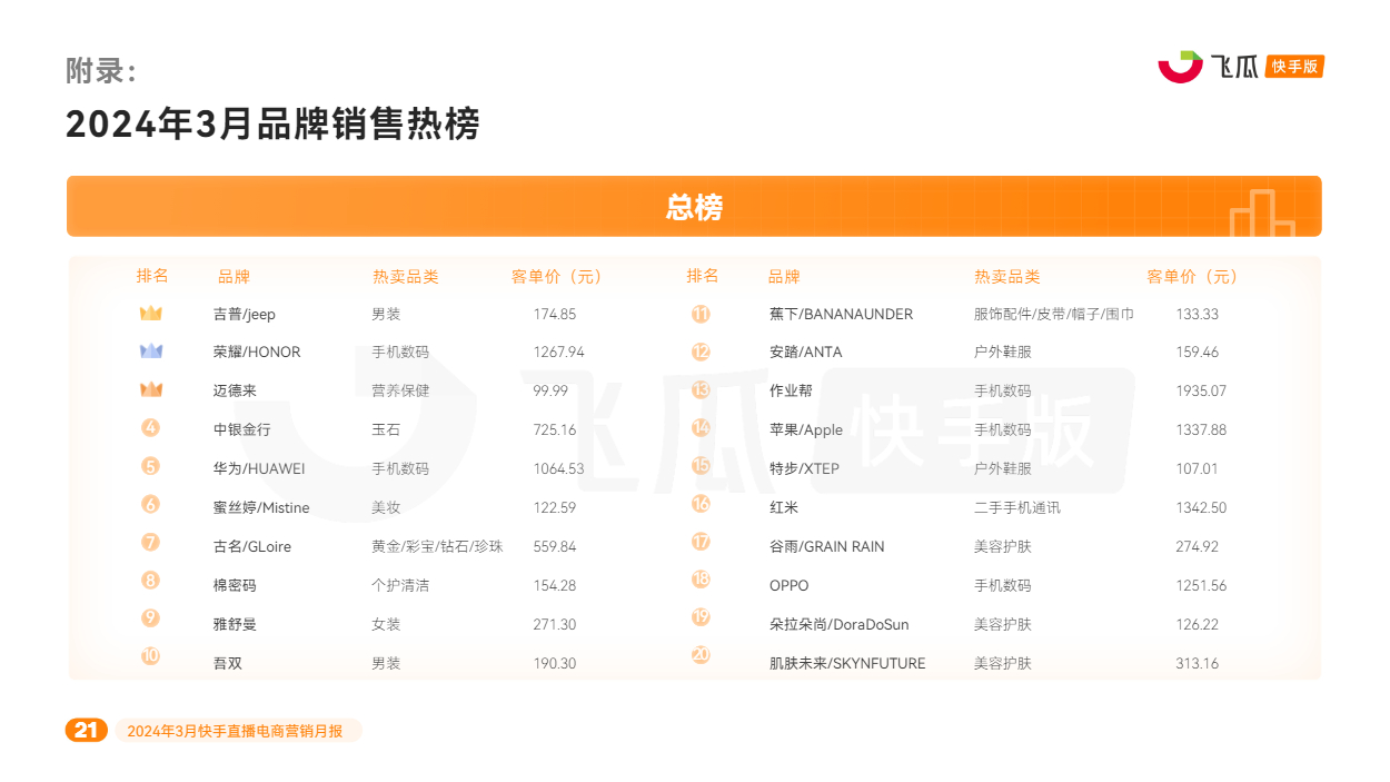 对此,飞瓜数据快手版出品《2024年3月快手直播电商营销月报》,回顾3月快手电商营销趋势及热卖品类,为品牌商家接下来生意增长提供参考。