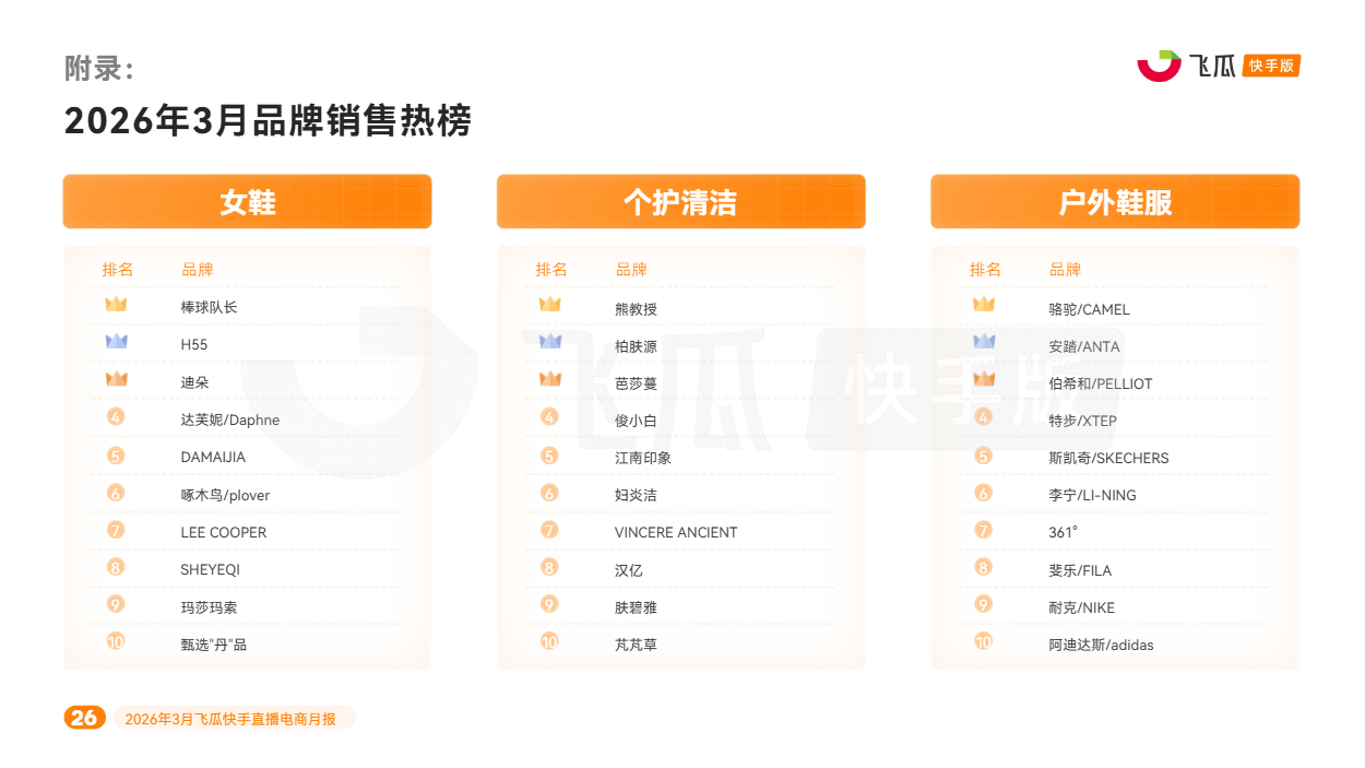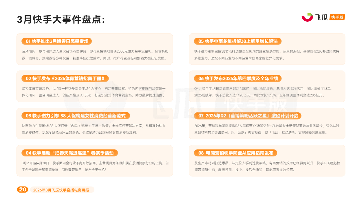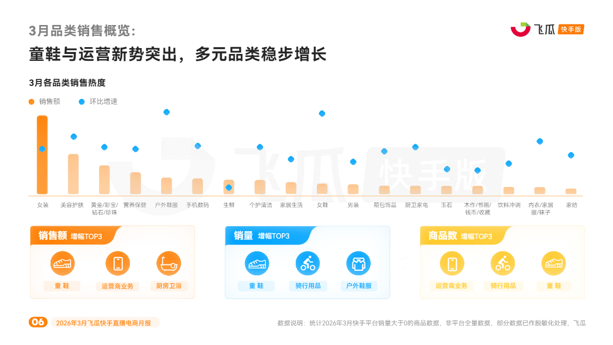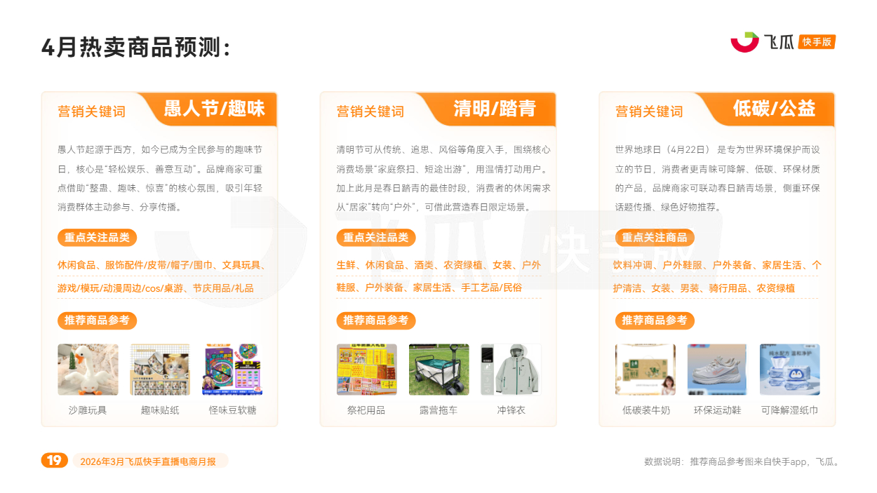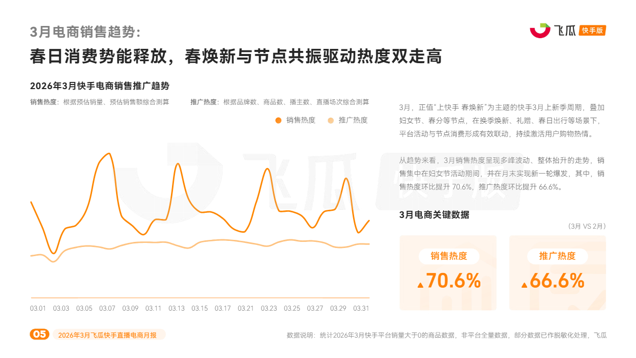 对此,飞瓜数据快手版出品《2026年3月飞瓜快手直播电商月报》,回顾3月快手电商营销趋势及热卖品类,助力品牌商家洞察市场、挖掘增长机遇。