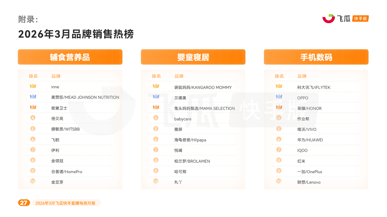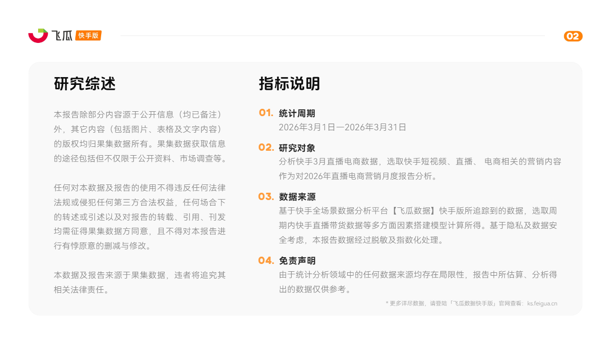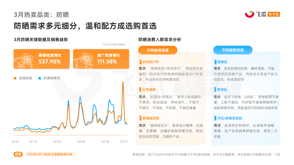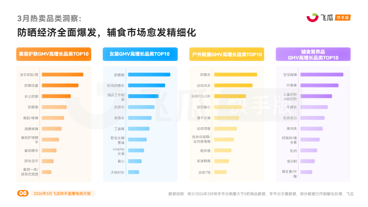 对此,飞瓜数据快手版出品《2026年3月飞瓜快手直播电商月报》,回顾3月快手电商营销趋势及热卖品类,助力品牌商家洞察市场、挖掘增长机遇。