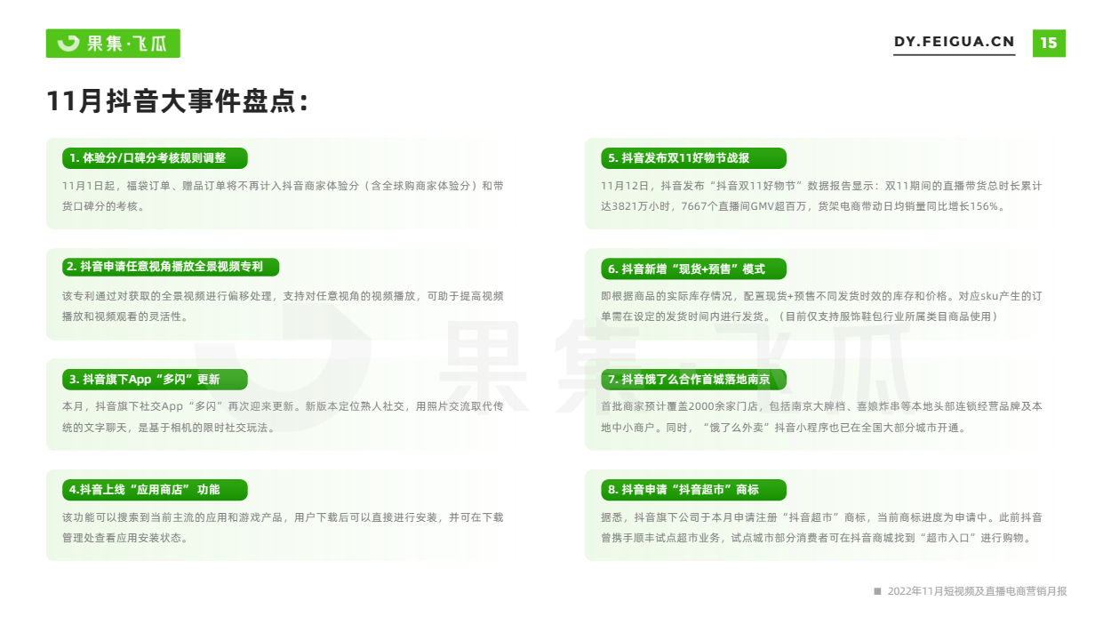 对此,飞瓜出品《2022年11月短视频及直播电商营销月报》,带你回顾本月电商热度趋势及爆款品牌,一起来看看吧!