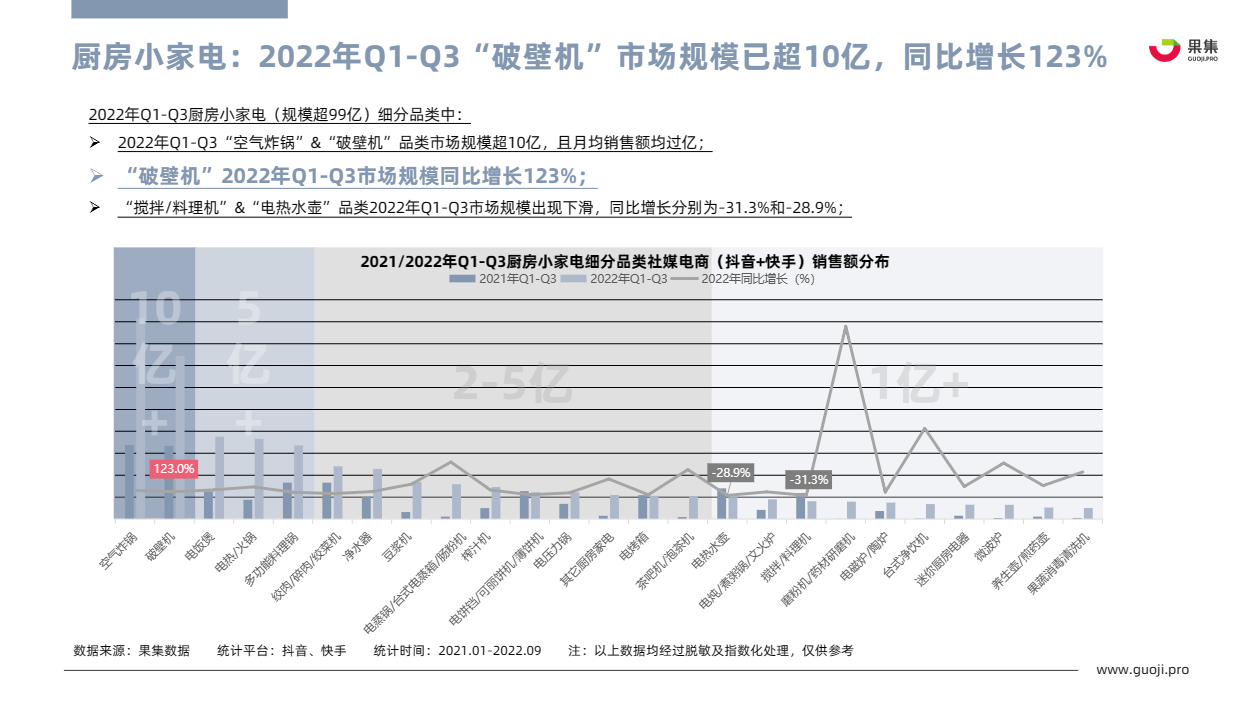 社媒电商的小家电市场2022年1-9月销售额三大品类销售额同比均有所增长。小家电市场新老品牌接踵入局,相关商品/店铺数量逐月稳定增长。