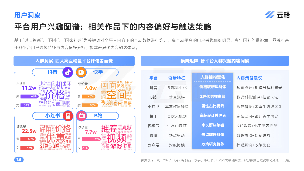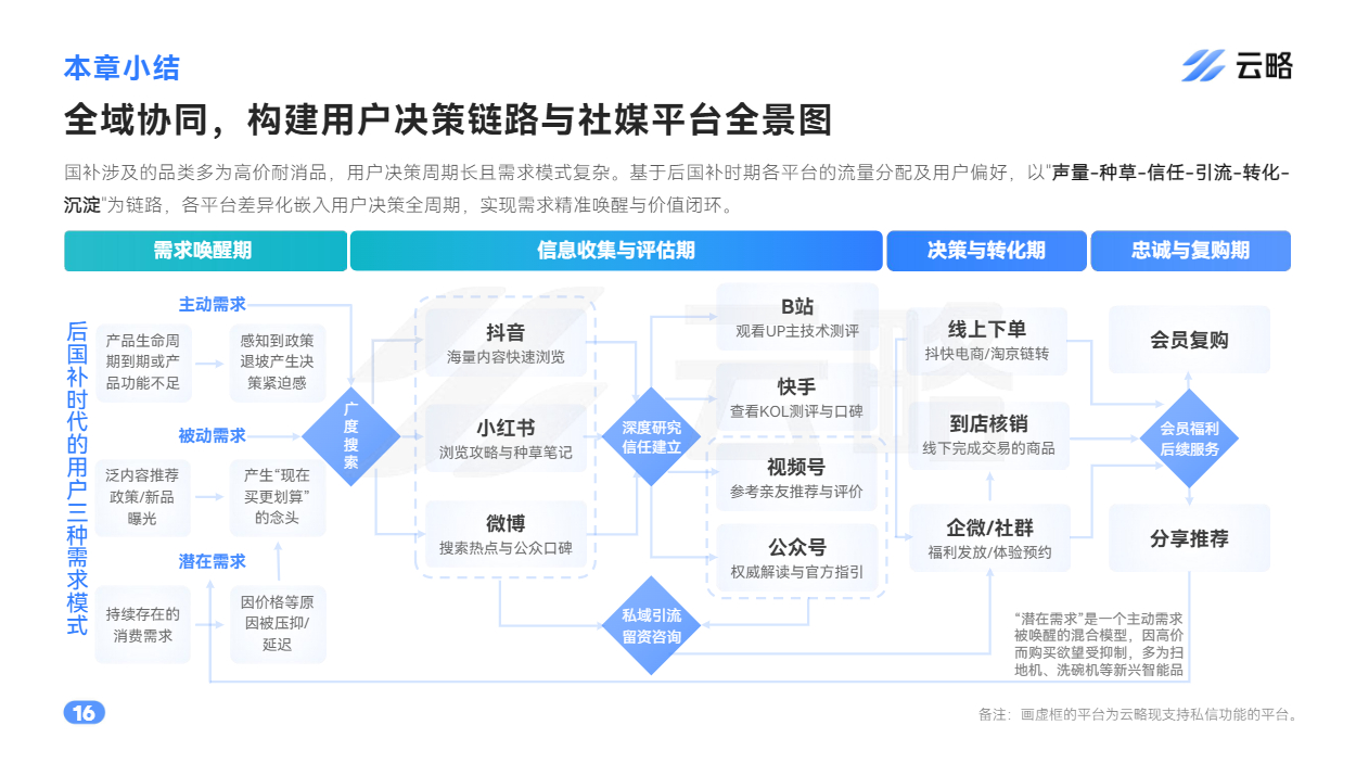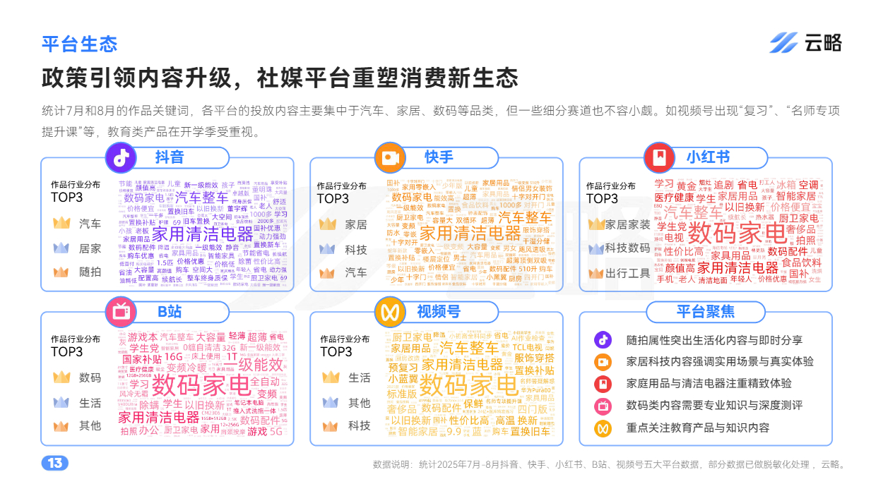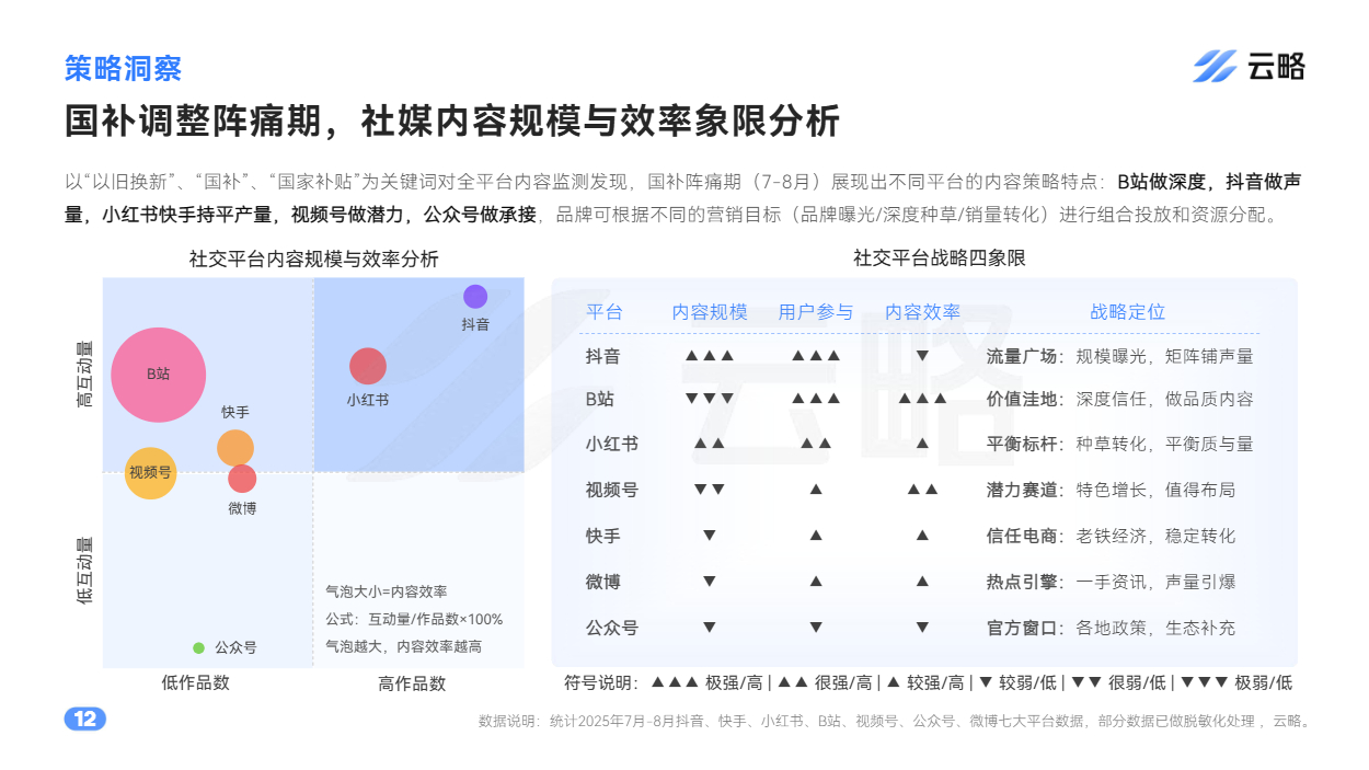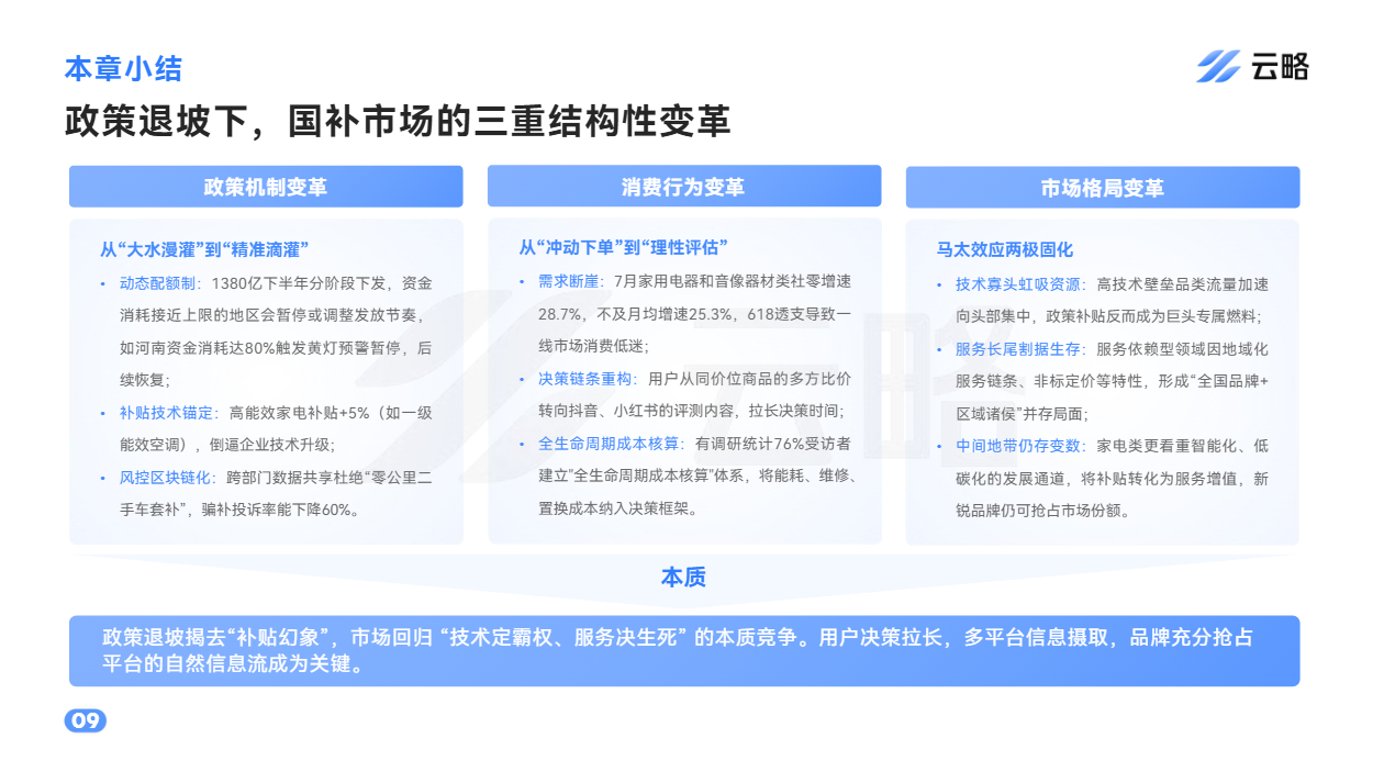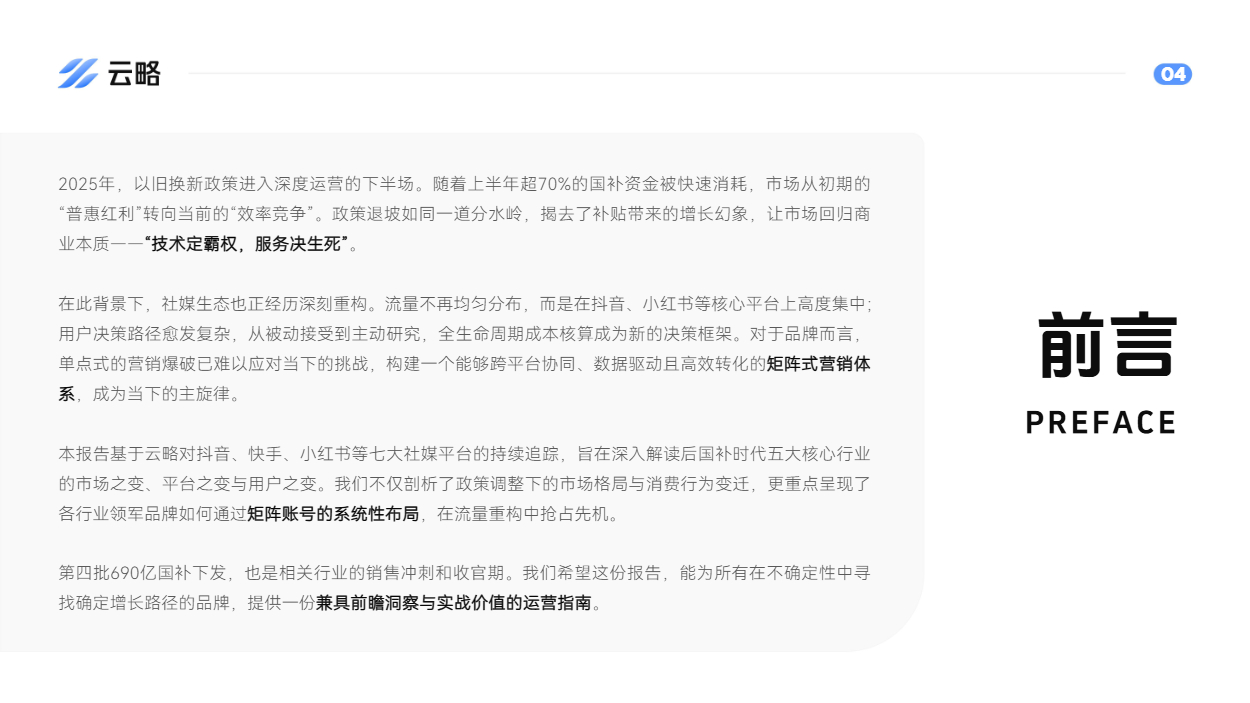 本报告基于云略对抖音、快手、小红书等七大社媒平台的持续追踪,深入解读后国补时代五大行业的变革。我们希望这份报告,能为所有在不确定性中寻找确定增长路径的品牌,提供一份兼具前瞻洞察与实战价值的运营指南。
