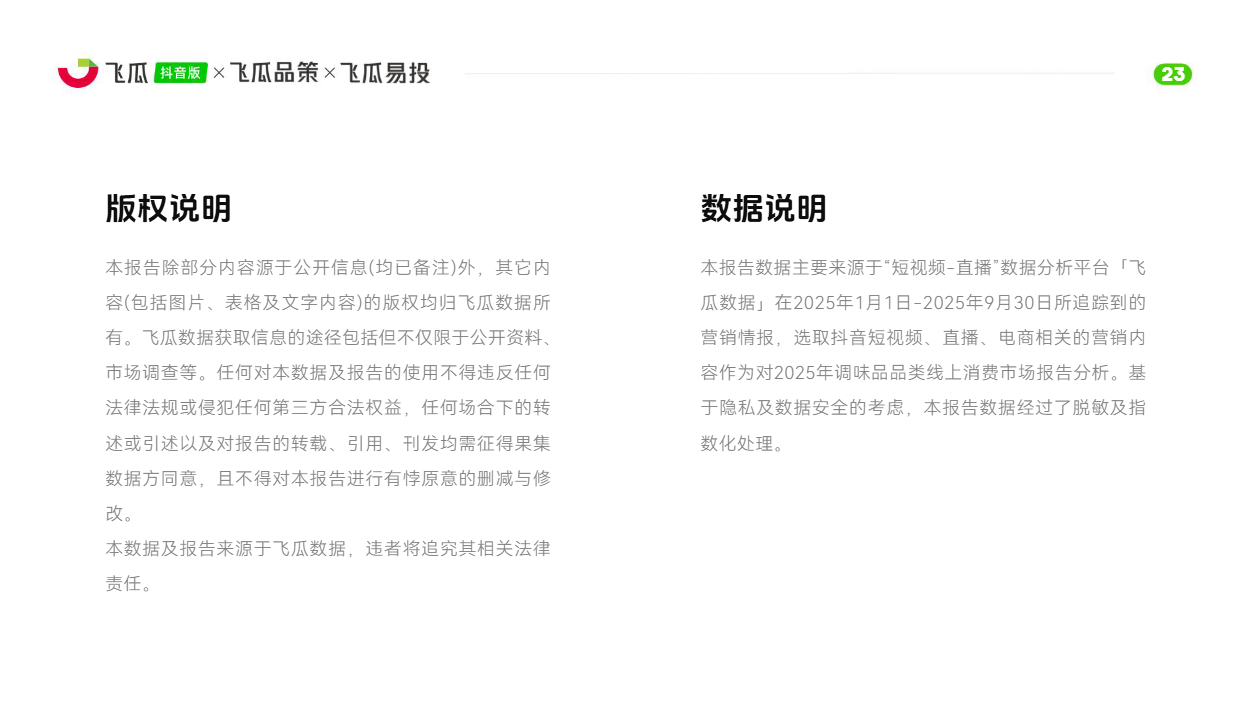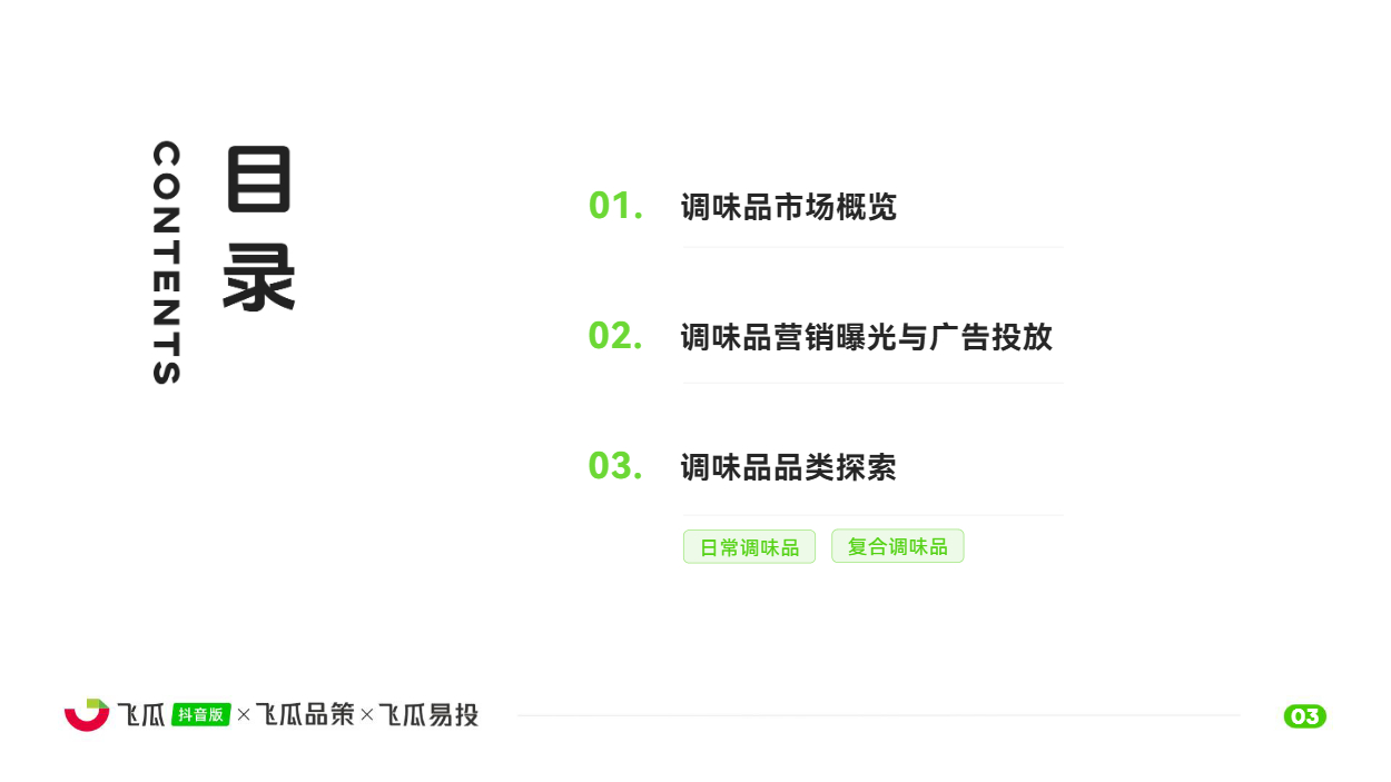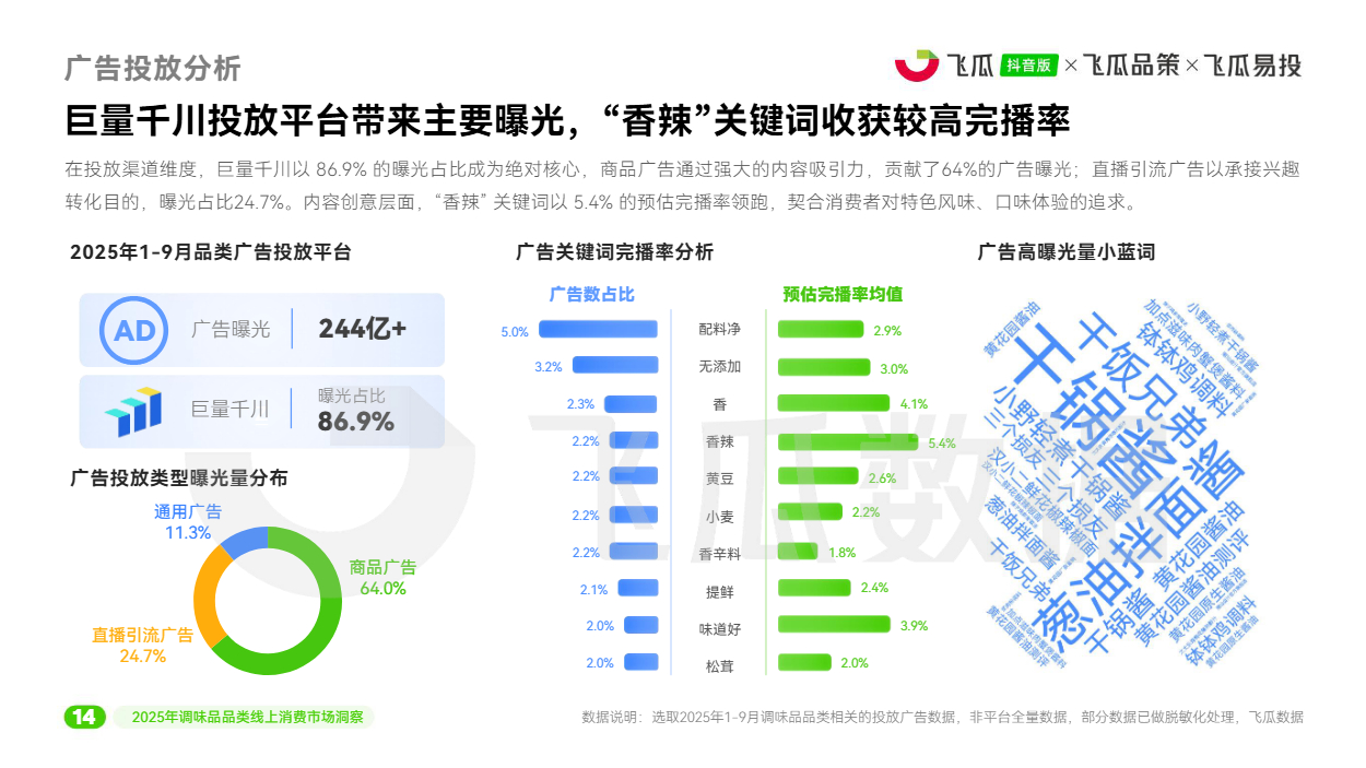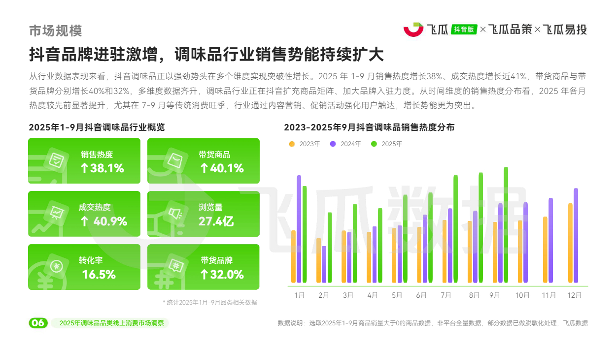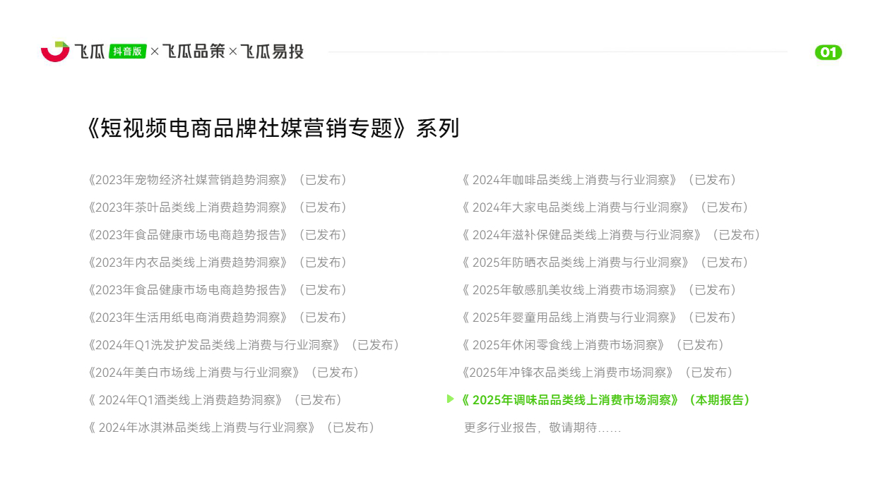 基于此,飞瓜数据× 飞瓜品策 x 飞瓜易投 联合出品《2025年调味品品类线上消费市场洞察》,从市场现状、营销与广告投放、细分品类分析等角度出发,了解抖音调味品市场发展趋势,找到未来电商营销突破口。