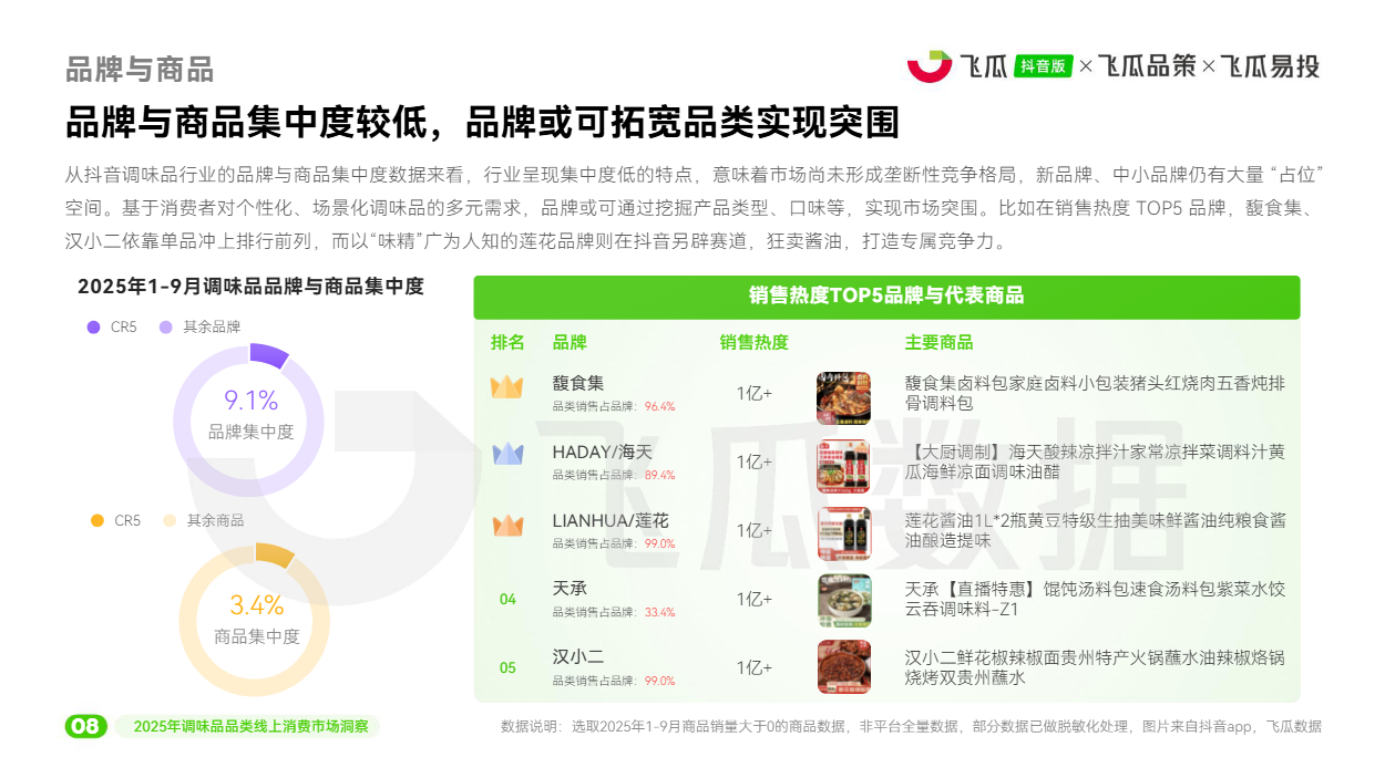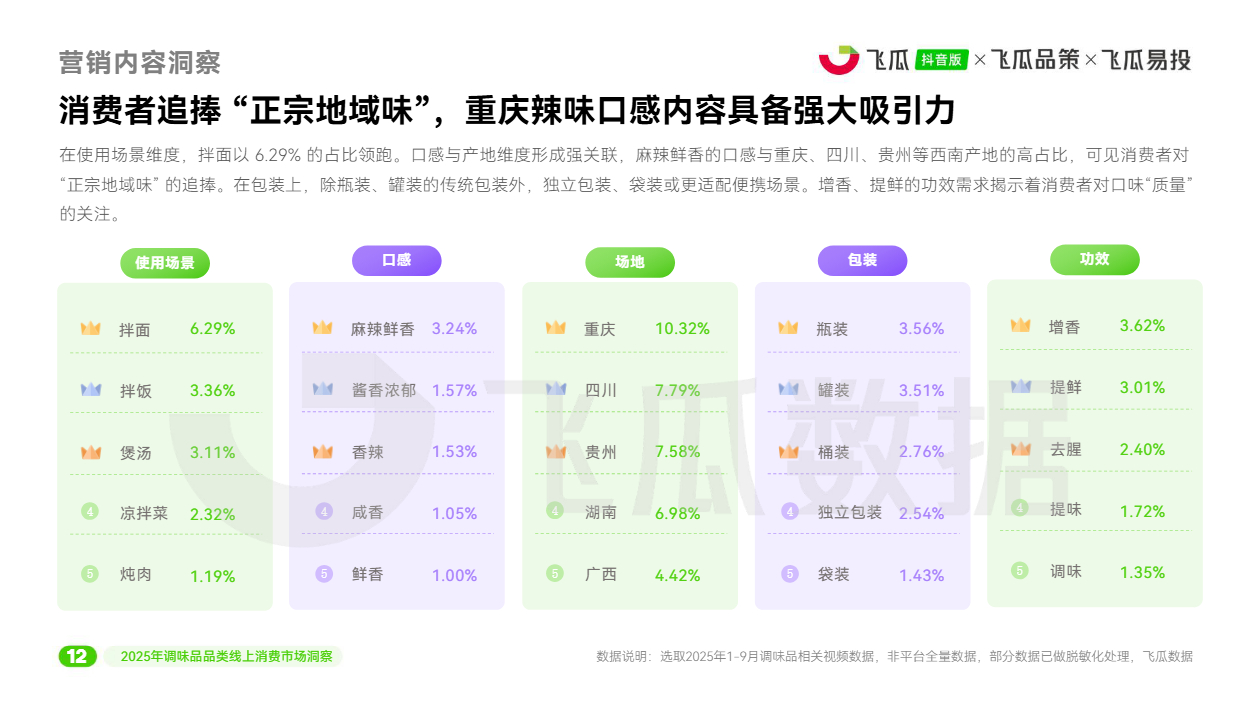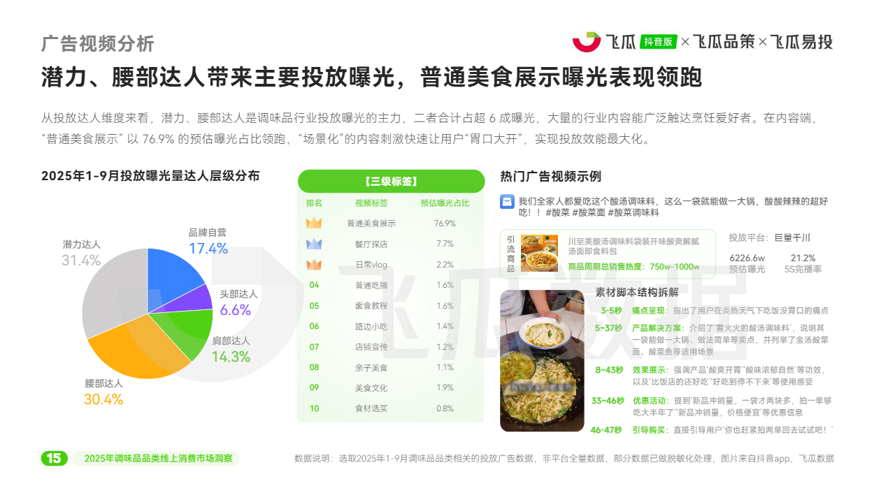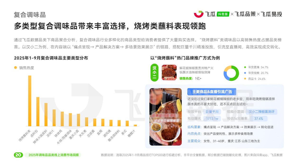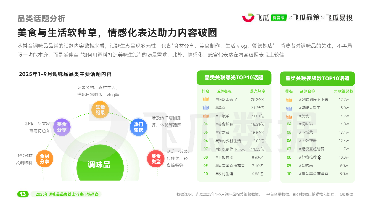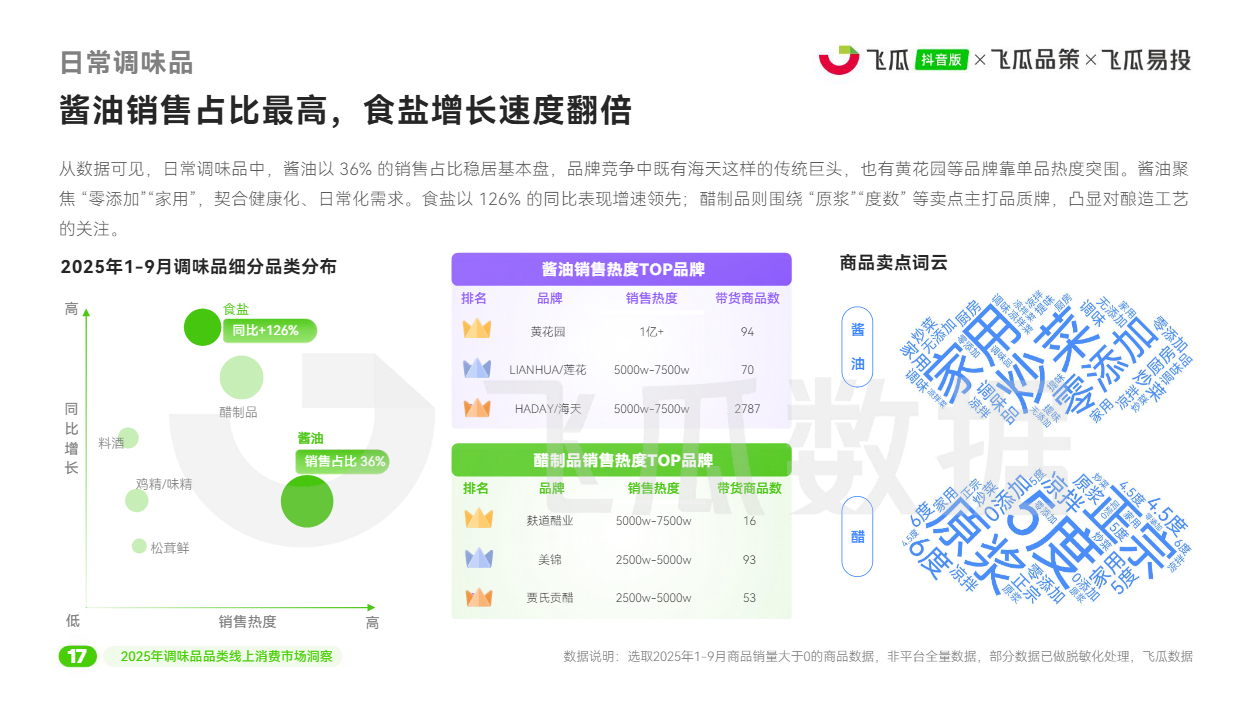 基于此,飞瓜数据× 飞瓜品策 x 飞瓜易投 联合出品《2025年调味品品类线上消费市场洞察》,从市场现状、营销与广告投放、细分品类分析等角度出发,了解抖音调味品市场发展趋势,找到未来电商营销突破口。
