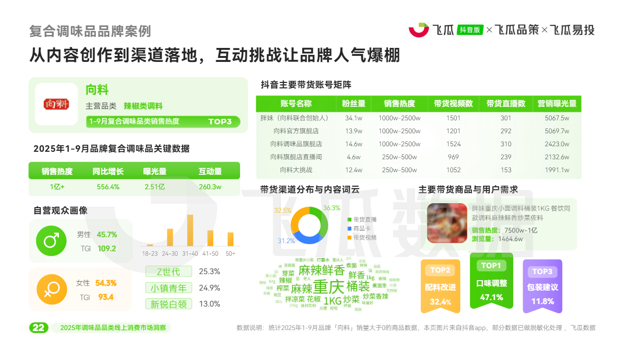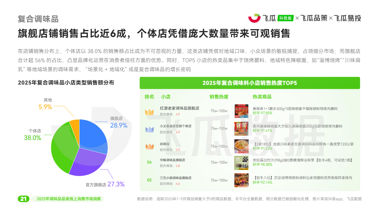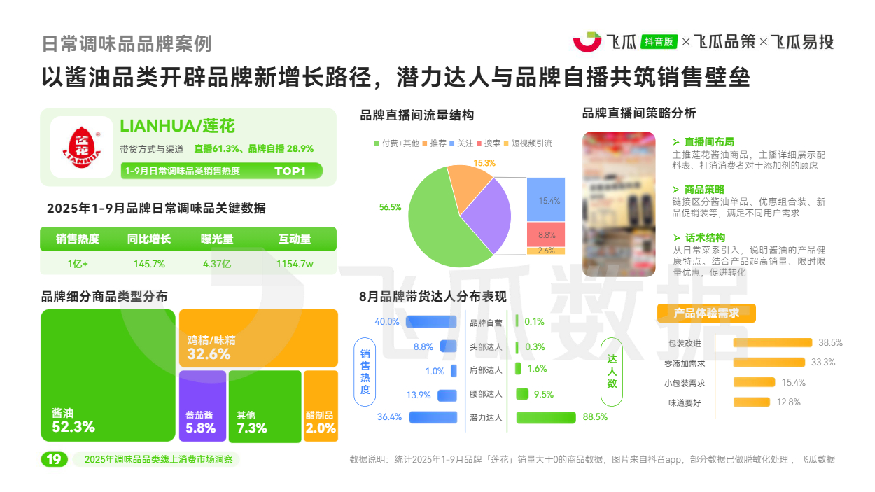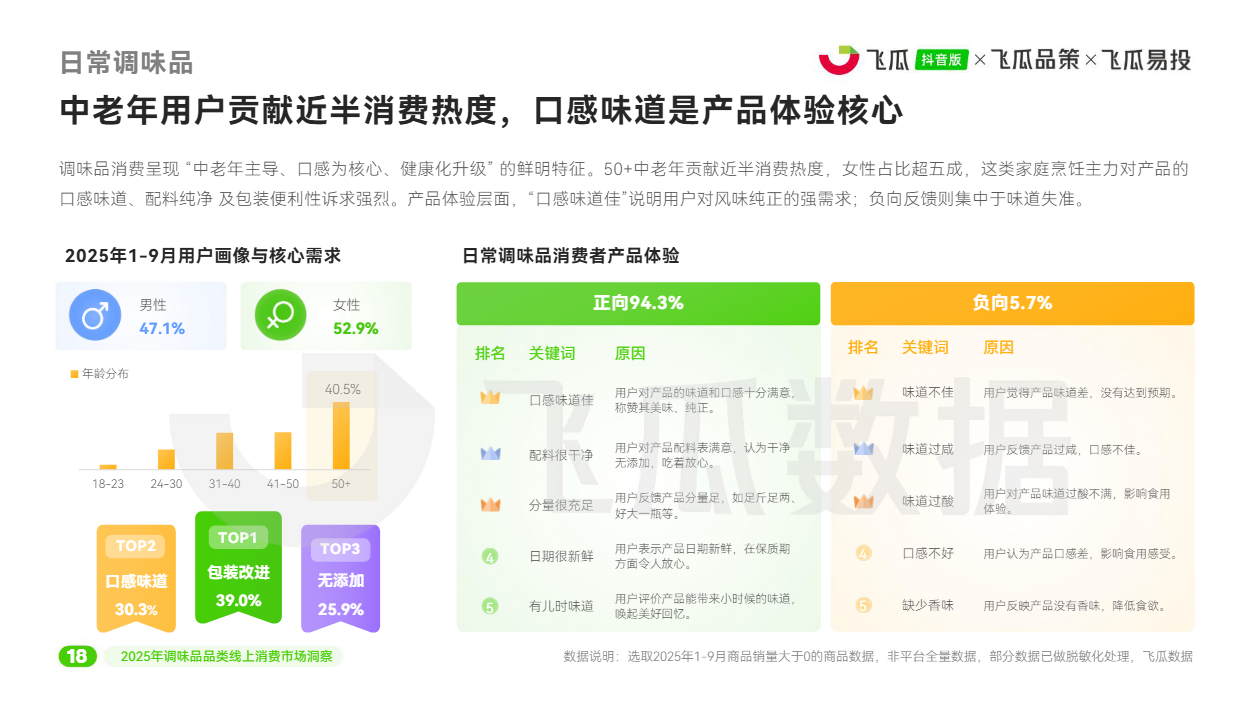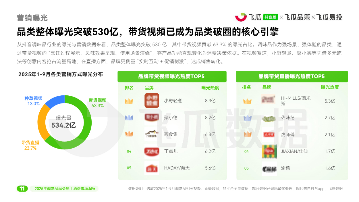 基于此,飞瓜数据× 飞瓜品策 x 飞瓜易投 联合出品《2025年调味品品类线上消费市场洞察》,从市场现状、营销与广告投放、细分品类分析等角度出发,了解抖音调味品市场发展趋势,找到未来电商营销突破口。