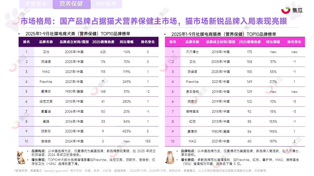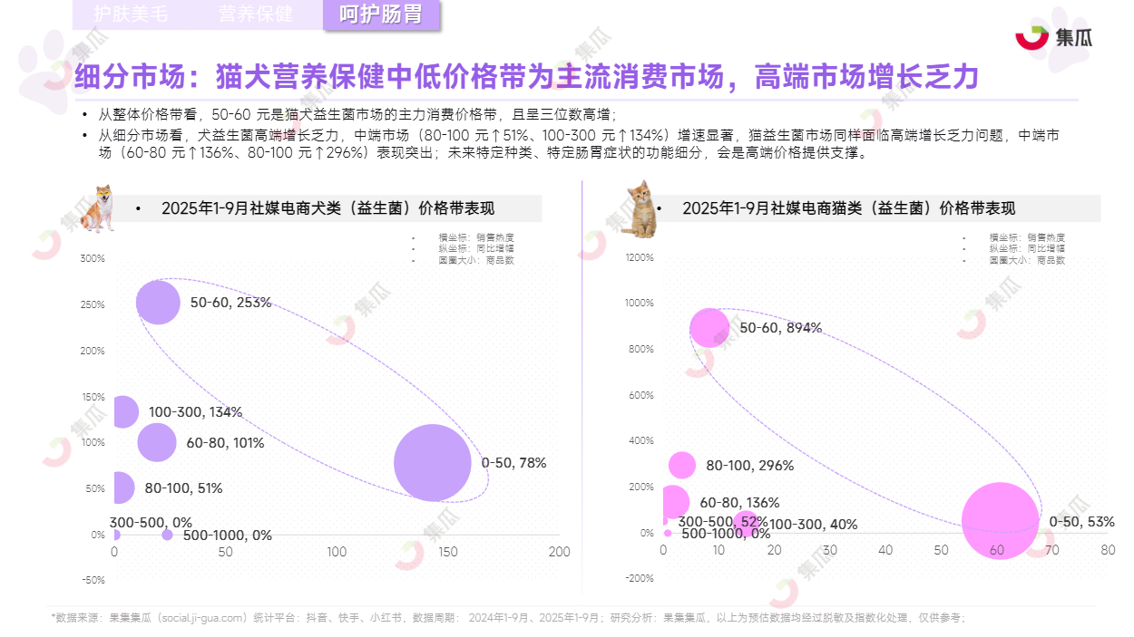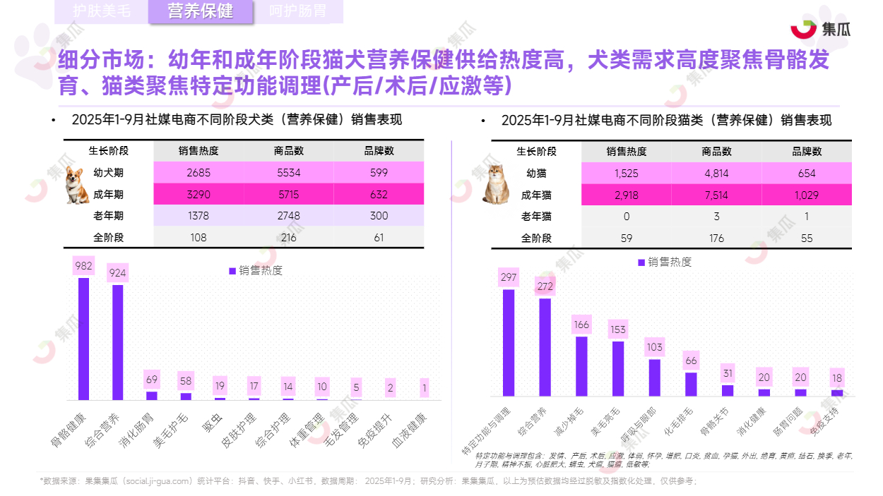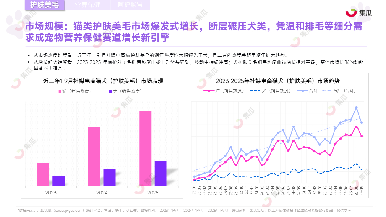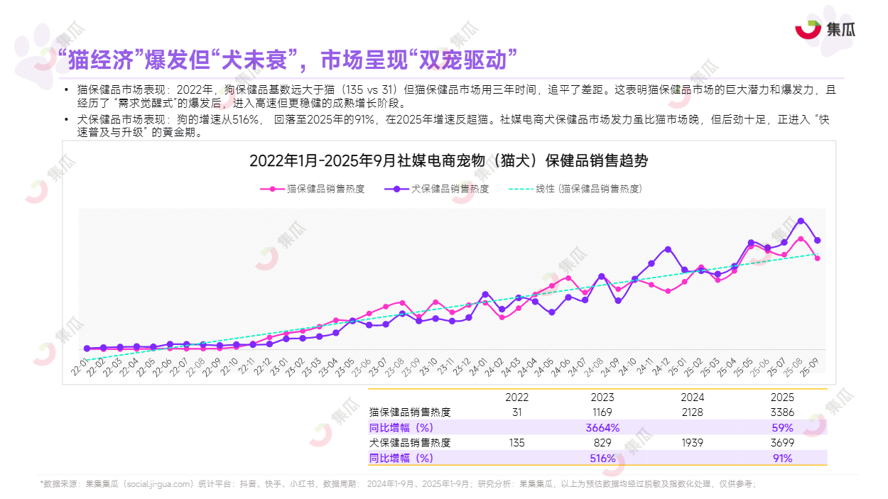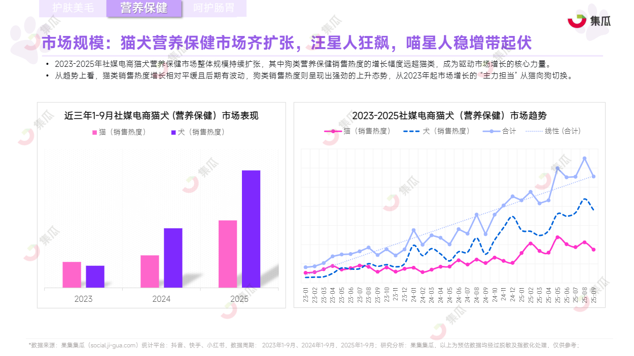 集瓜数据显示,2025年1-9月社媒电商渠道宠物保健品以97%的同比增速位列品类第二,成为宠物经济的重要增长类目。