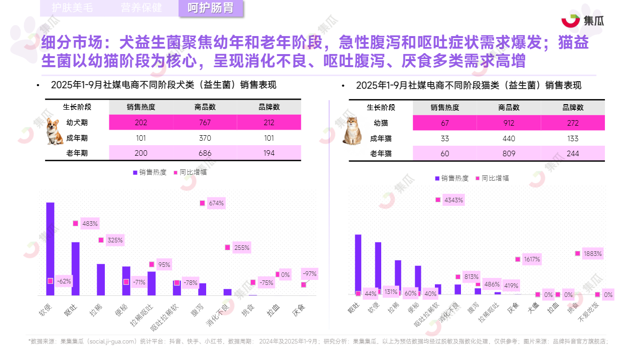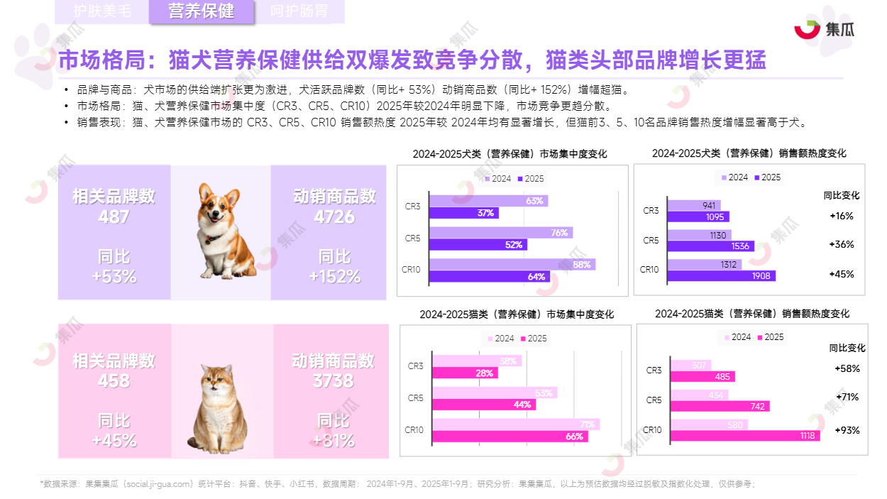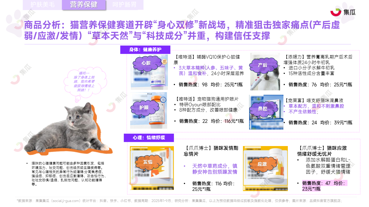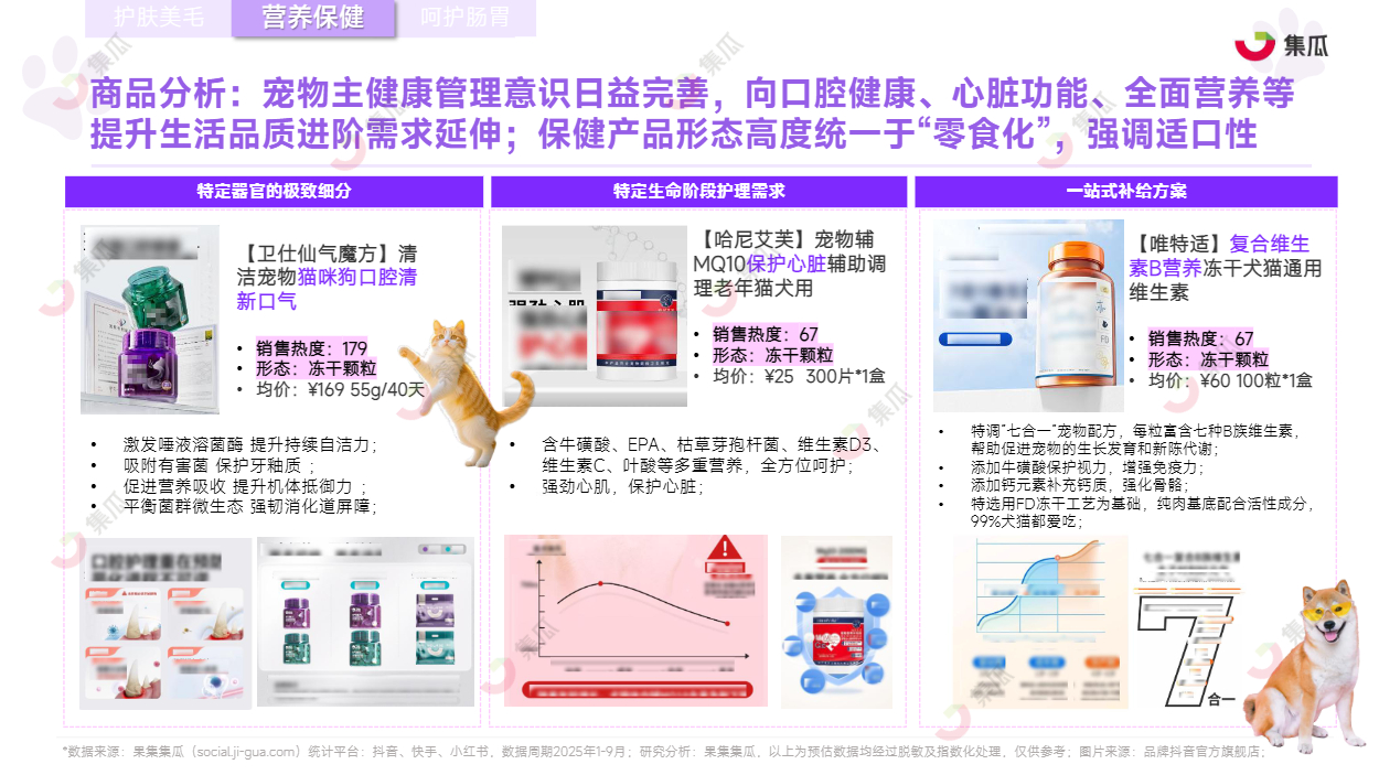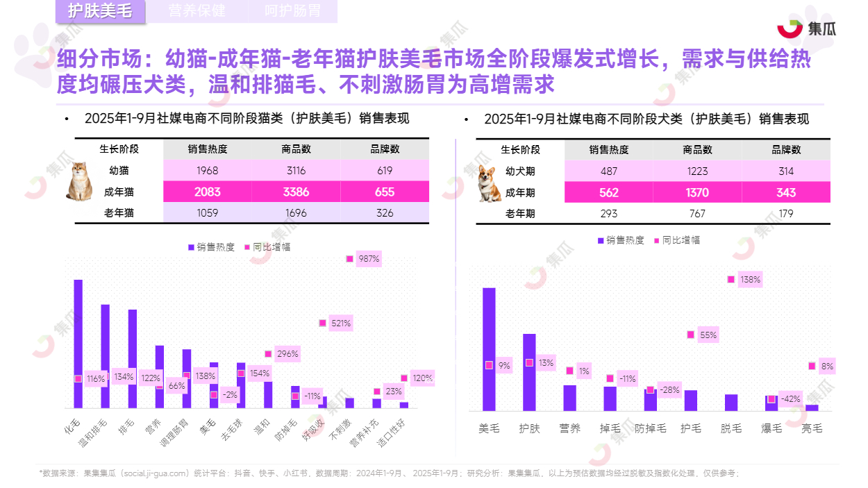 集瓜数据显示,2025年1-9月社媒电商渠道宠物保健品以97%的同比增速位列品类第二,成为宠物经济的重要增长类目。
