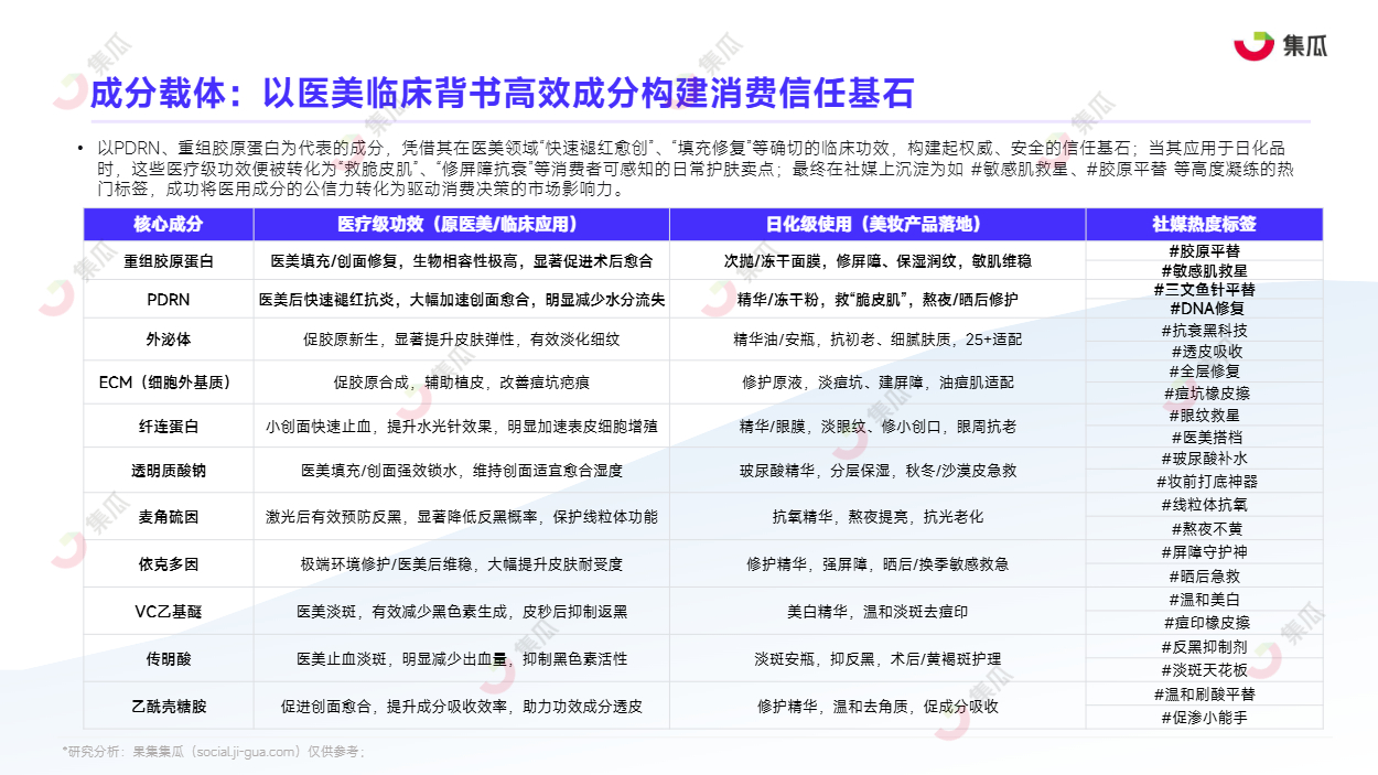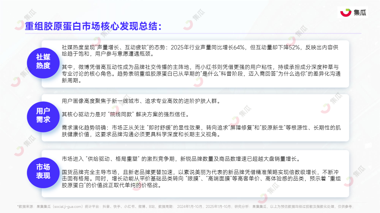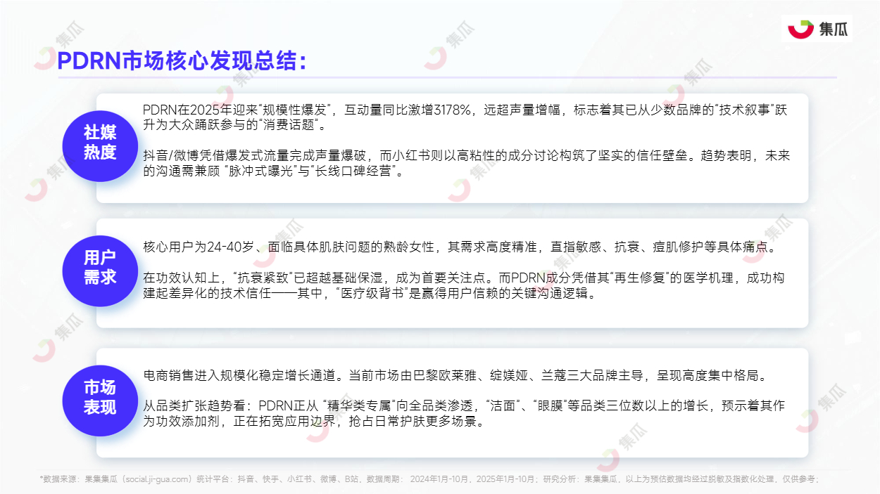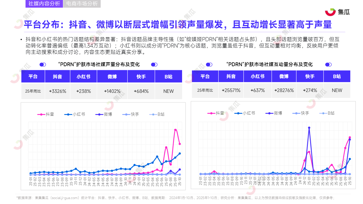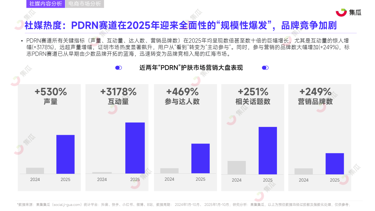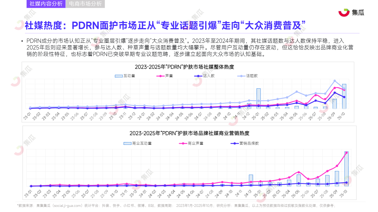 集瓜数据发布《从医用到护肤:解码PDRN与重组胶原蛋白品牌出圈密码》基于抖音、快手、小红书等五大平台的深度报告,解锁医用成分破圈逻辑,看懂爆款品牌的增长密码。